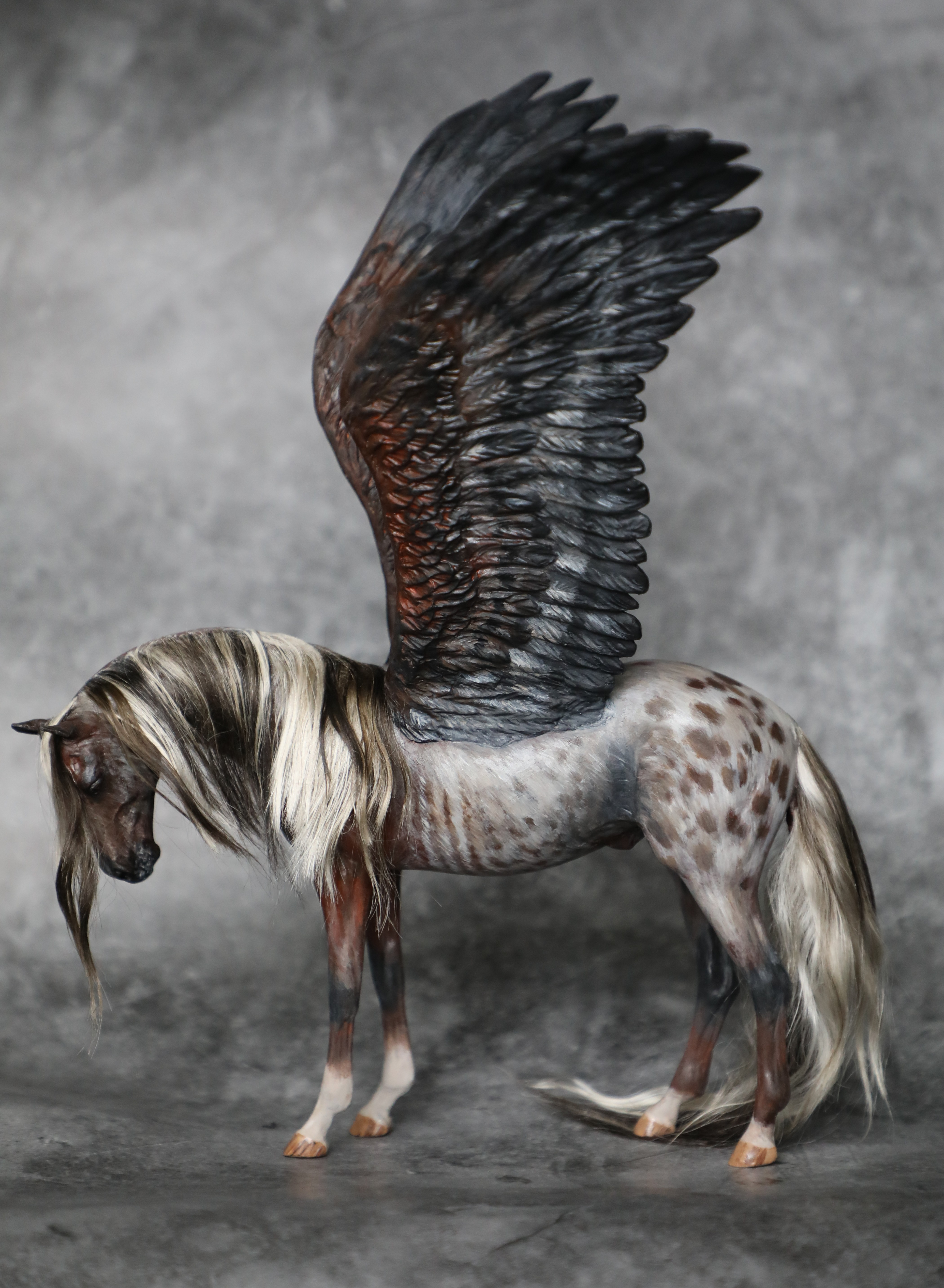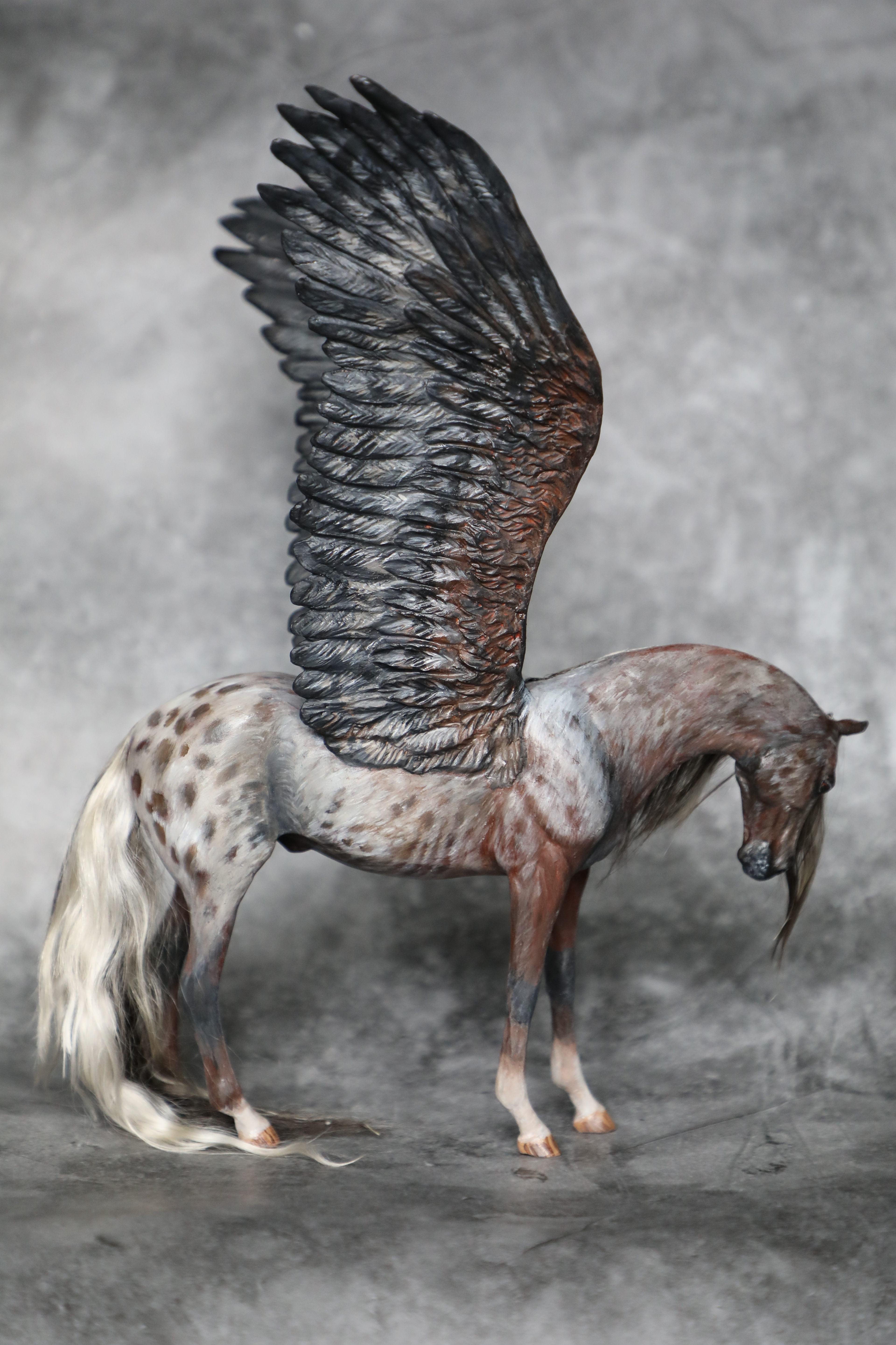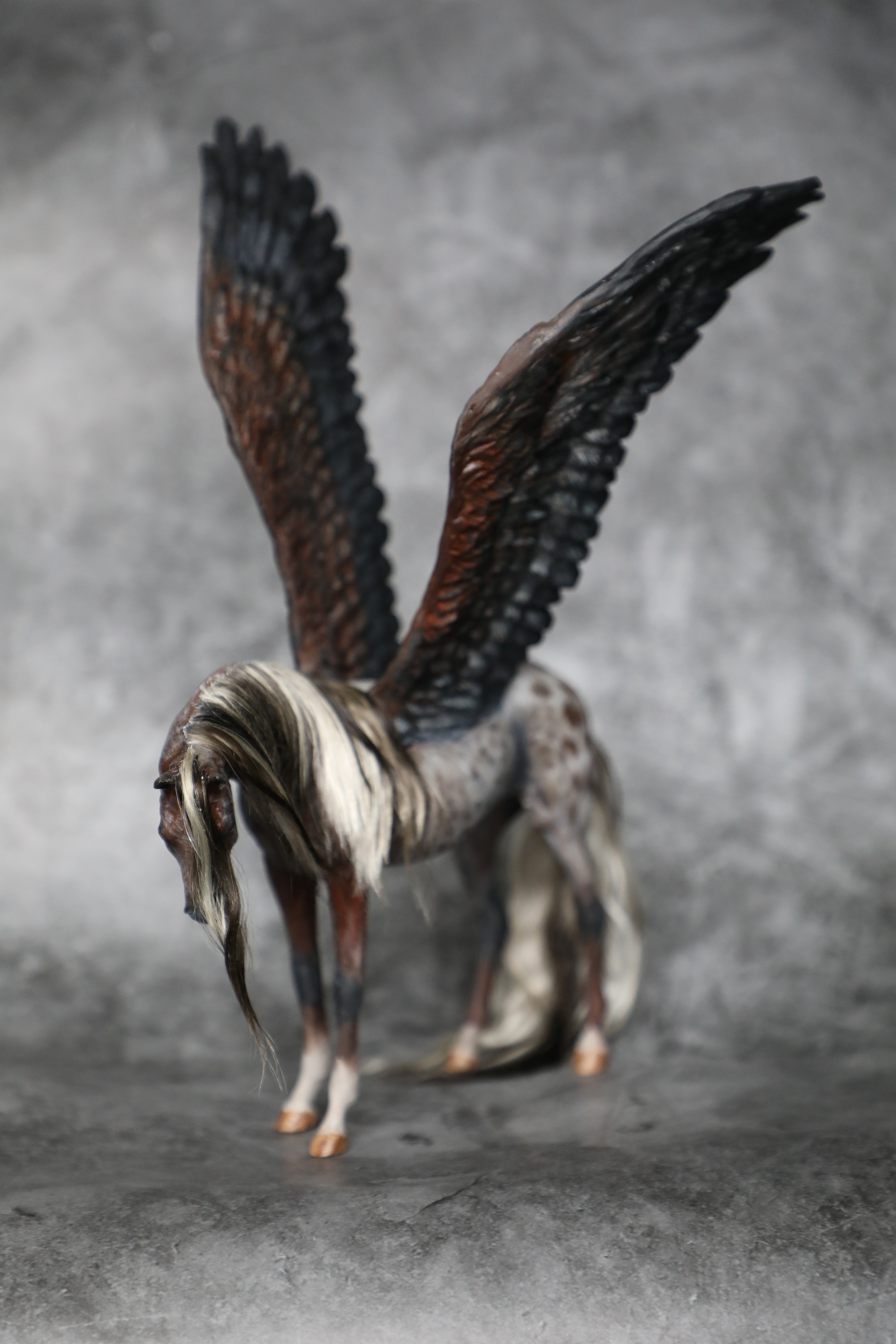 Adansonii is a customized Witness resin to a beautiful bay blanket appaloosa pegasus. He is extremely detailed with hair by hair detailing and vibrant shading. His hair is high quality angora mohair. He is "classic" size appox 11.5 inches tall to wing tip.