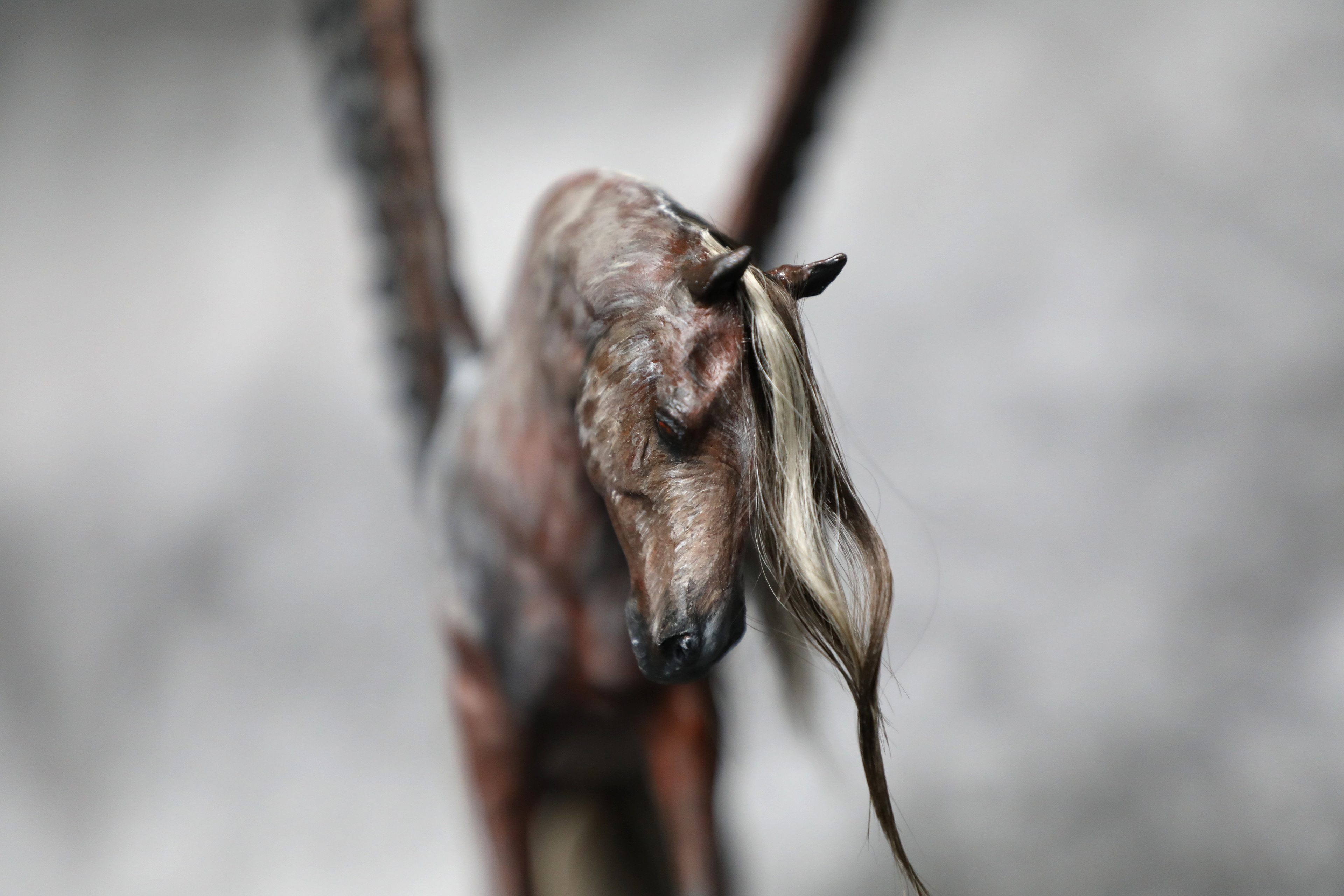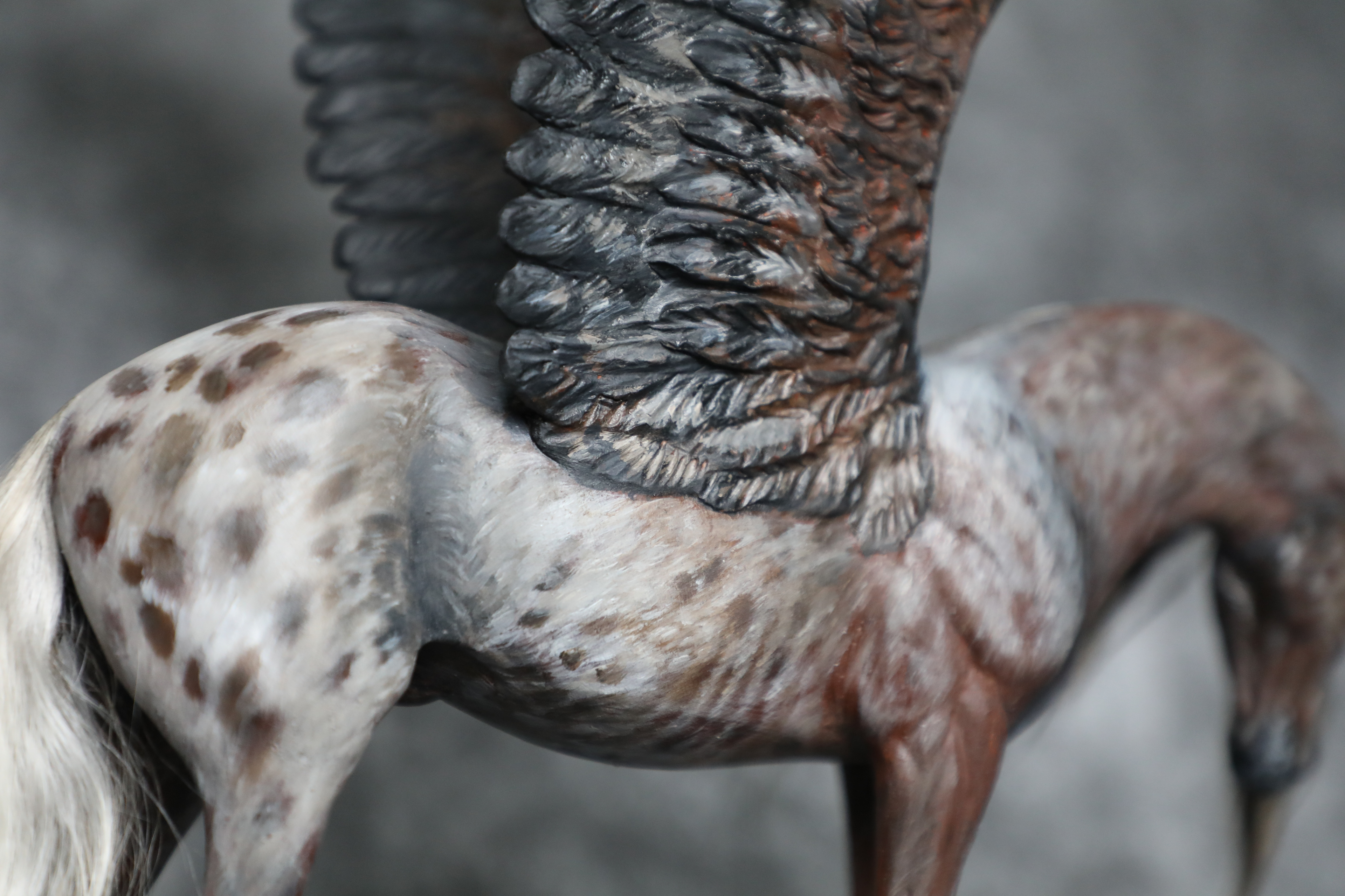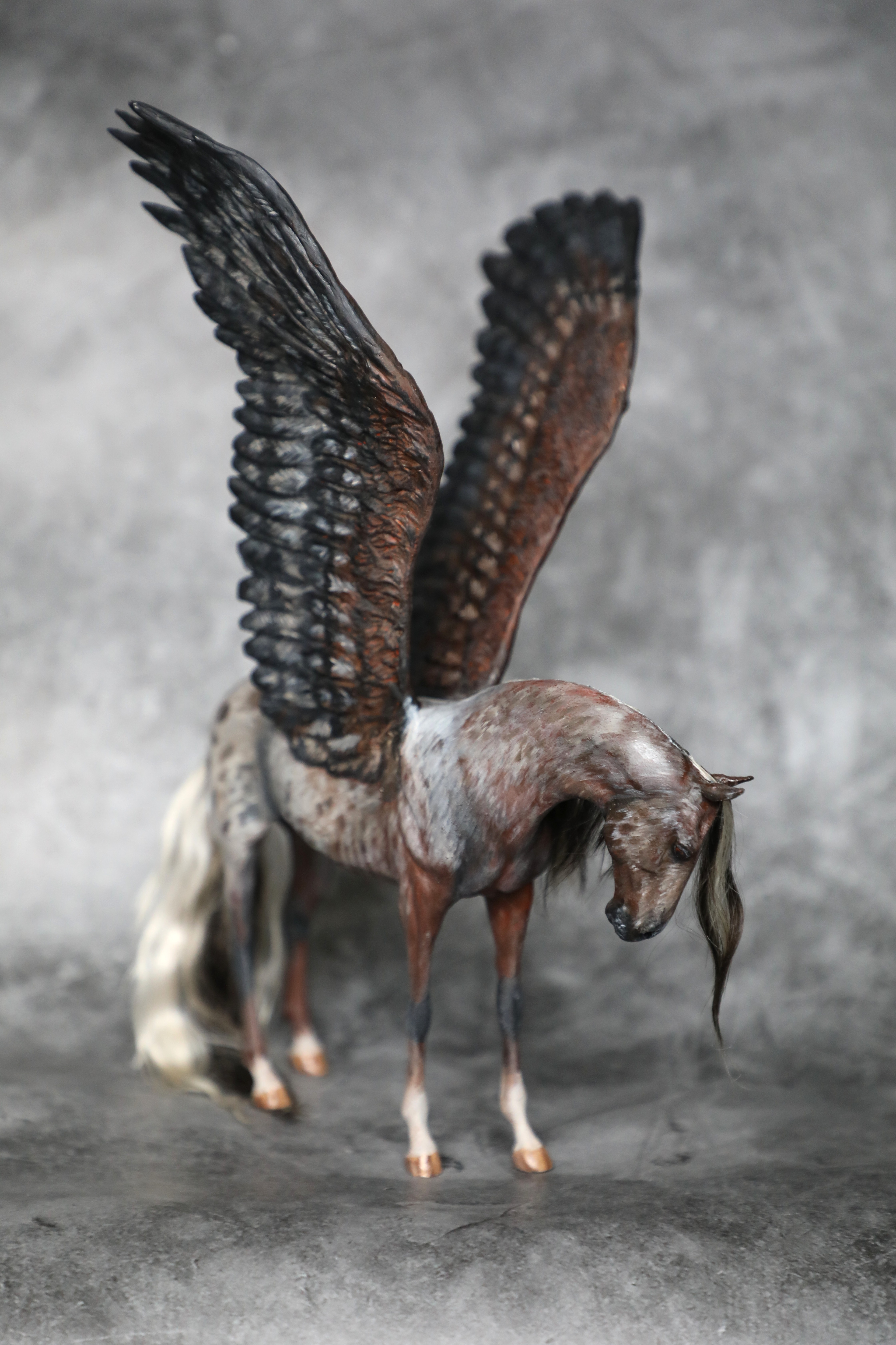 Adansonii is a customized Witness resin to a beautiful bay blanket appaloosa pegasus. He is extremely detailed with hair by hair detailing and vibrant shading. His hair is high quality angora mohair. He is "classic" size appox 11.5 inches tall to wing tip.