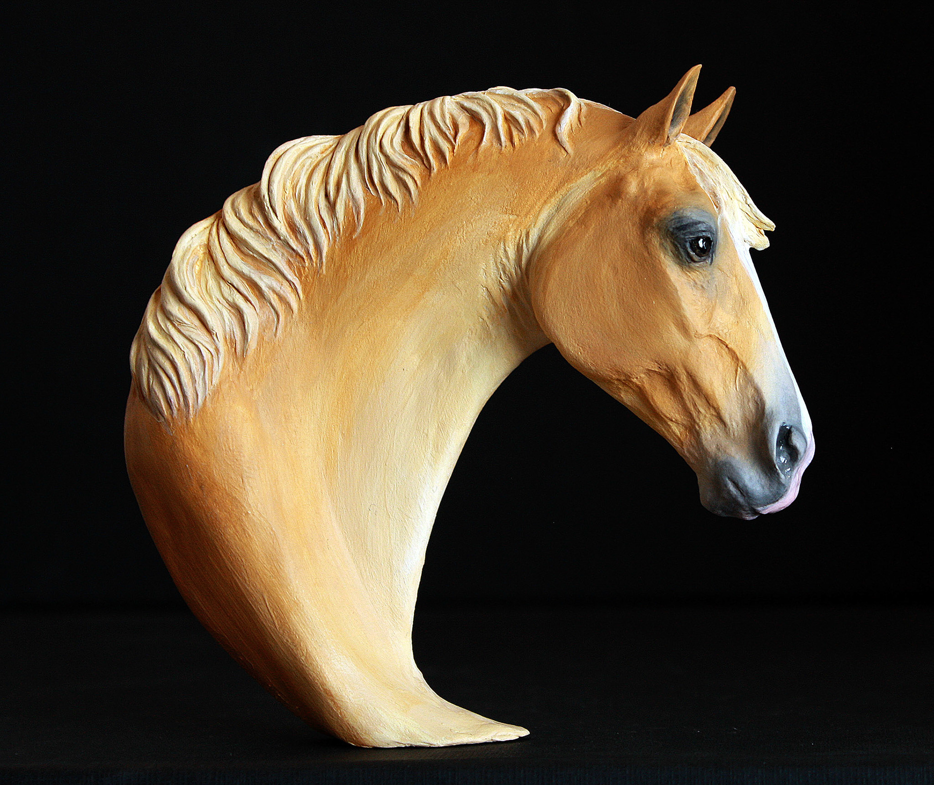 Beckoning is a one of a kind horse bust created in epoxy sculpt in 2019. It measures about 4.5 inches tall, and was painted to a soft palomino.