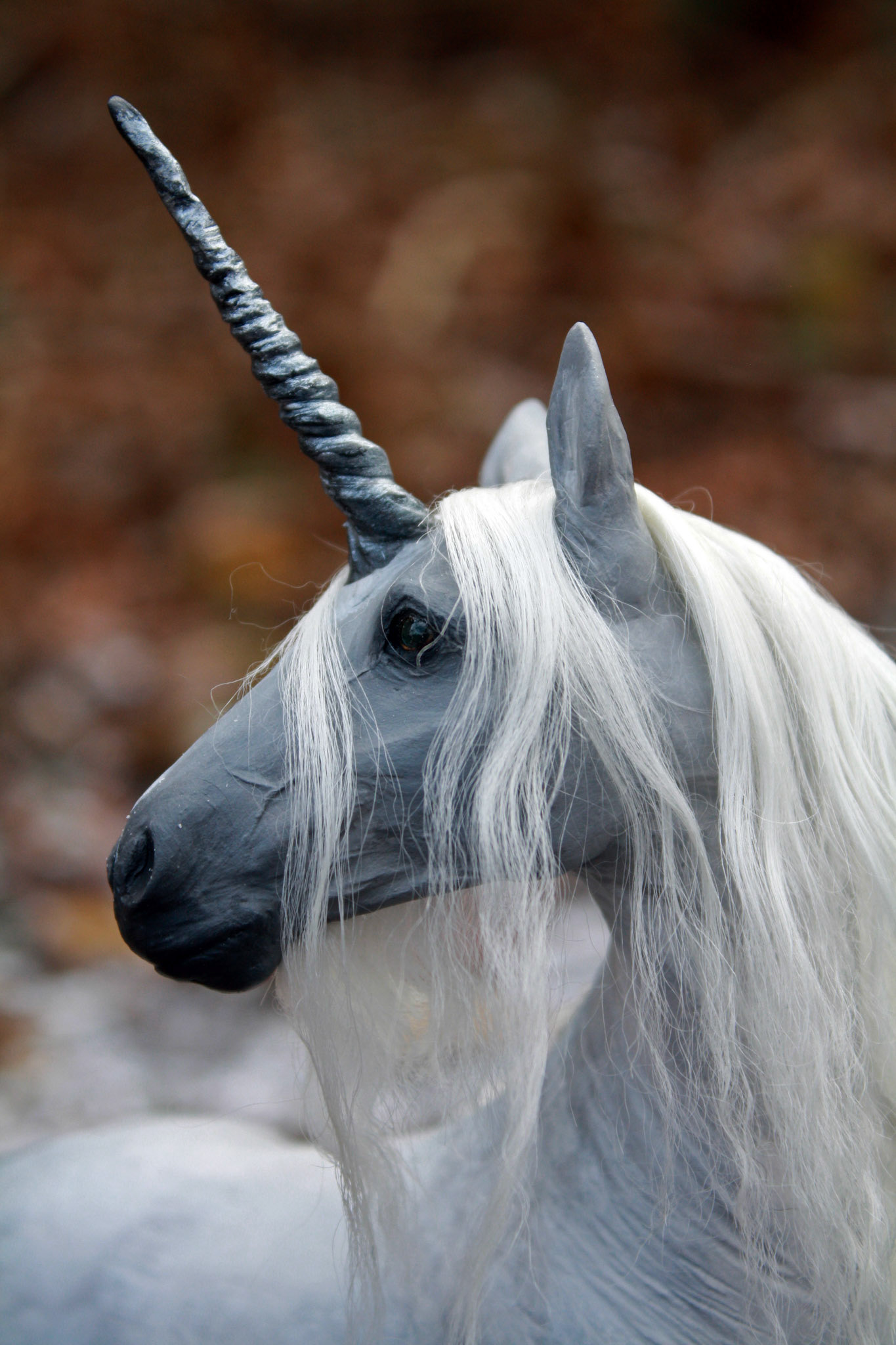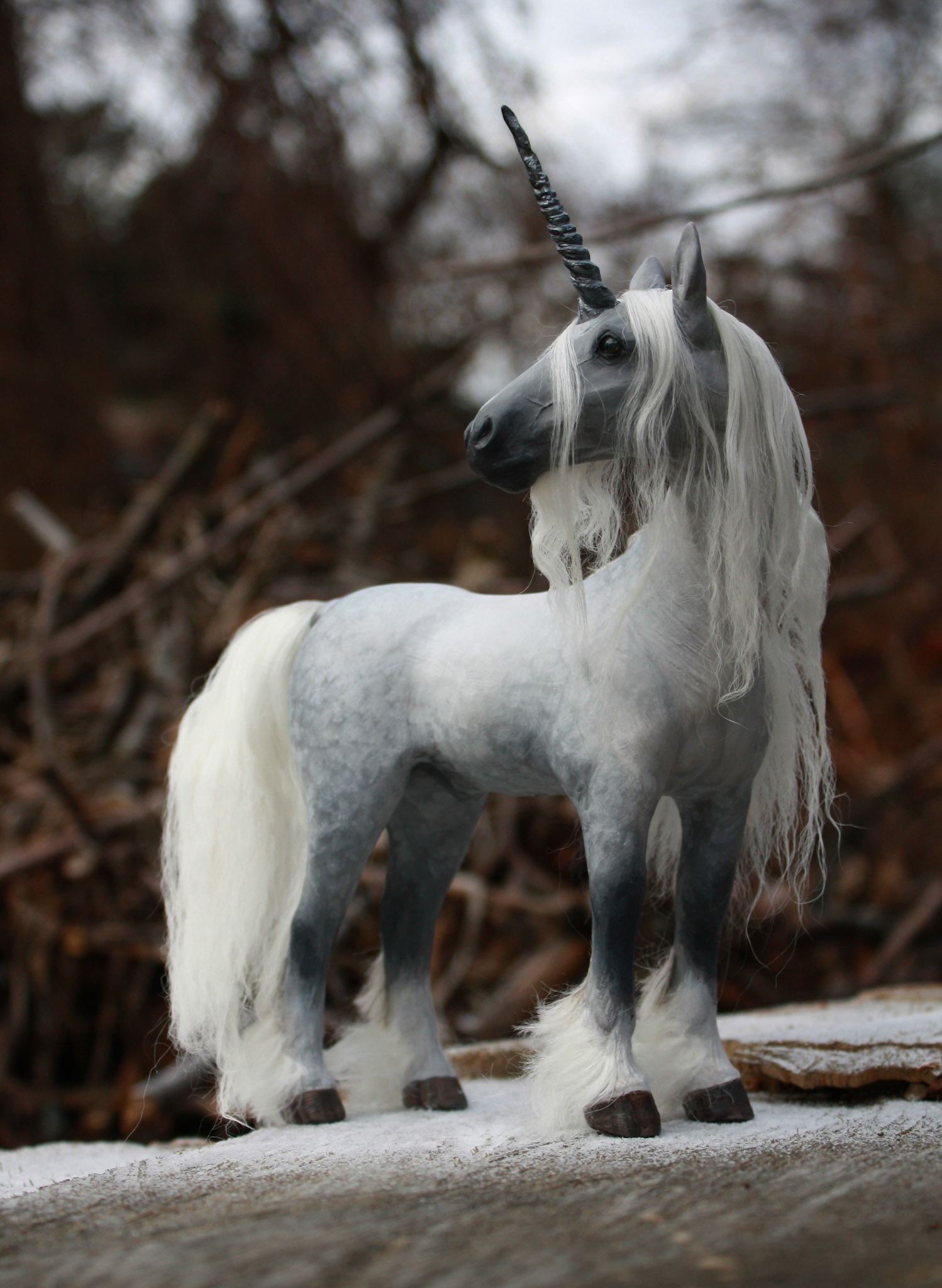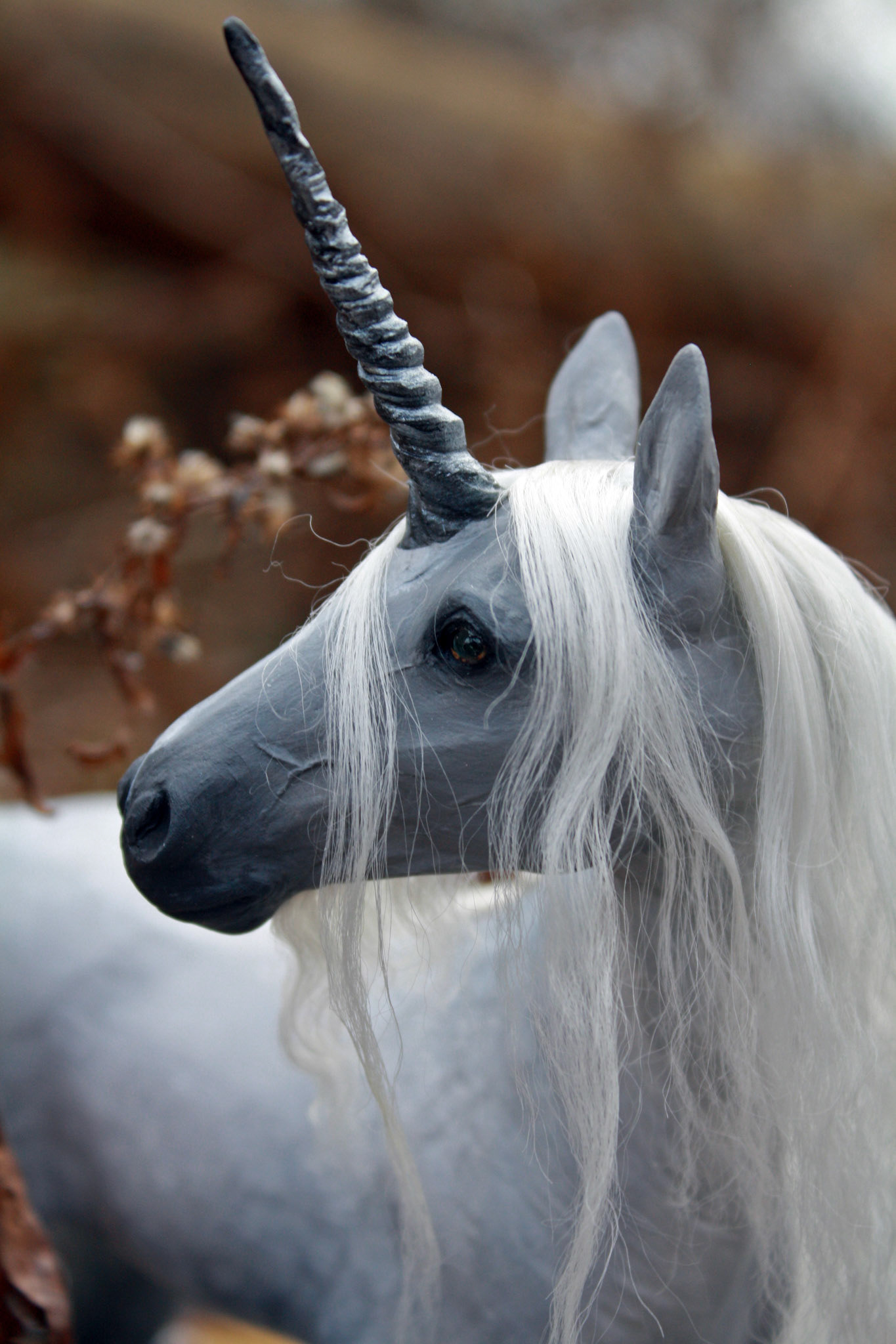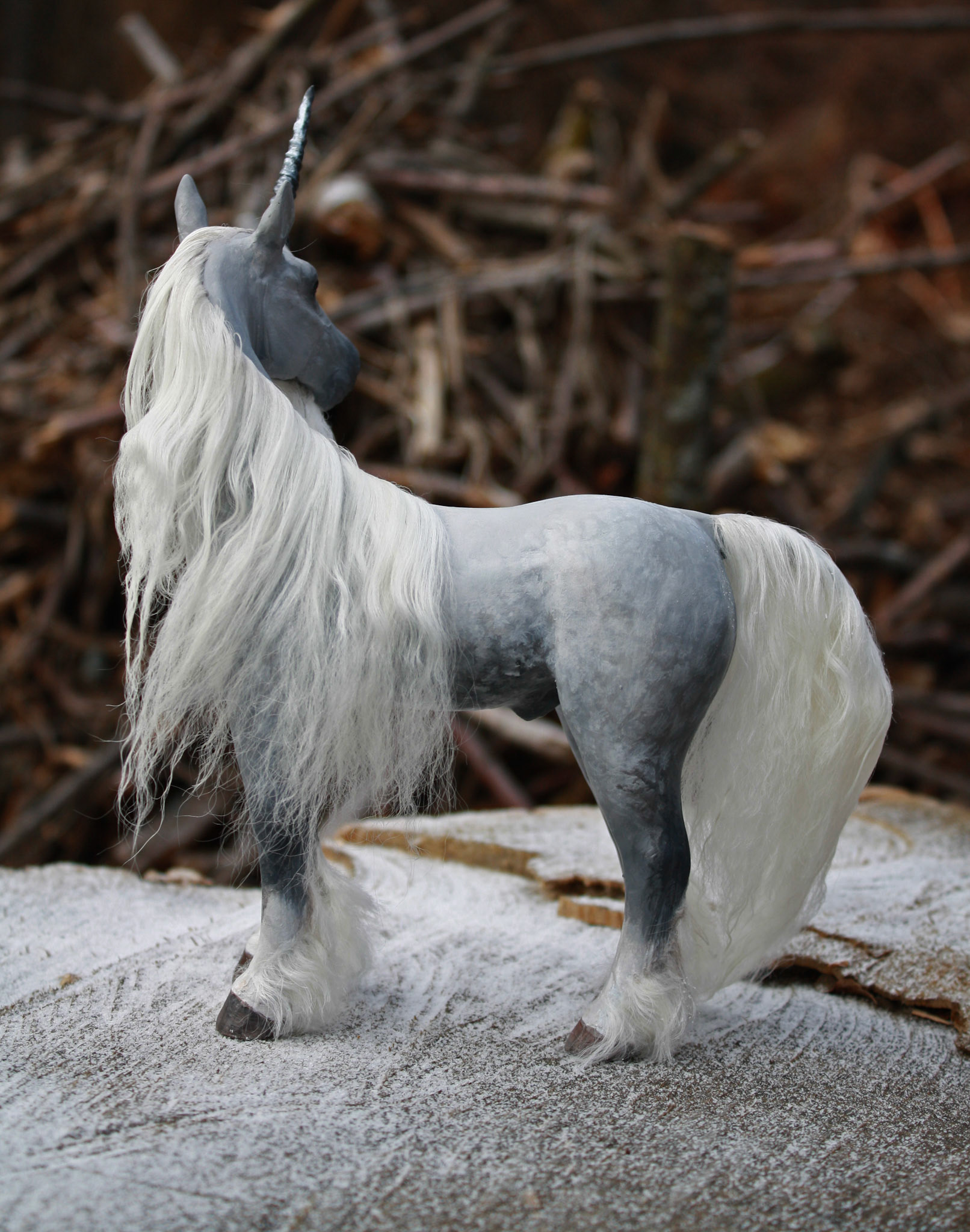 Dappled unicorn sculpture, created in 2015. Polymer clay and acrylics. About 7.5 inches tall. Sold.