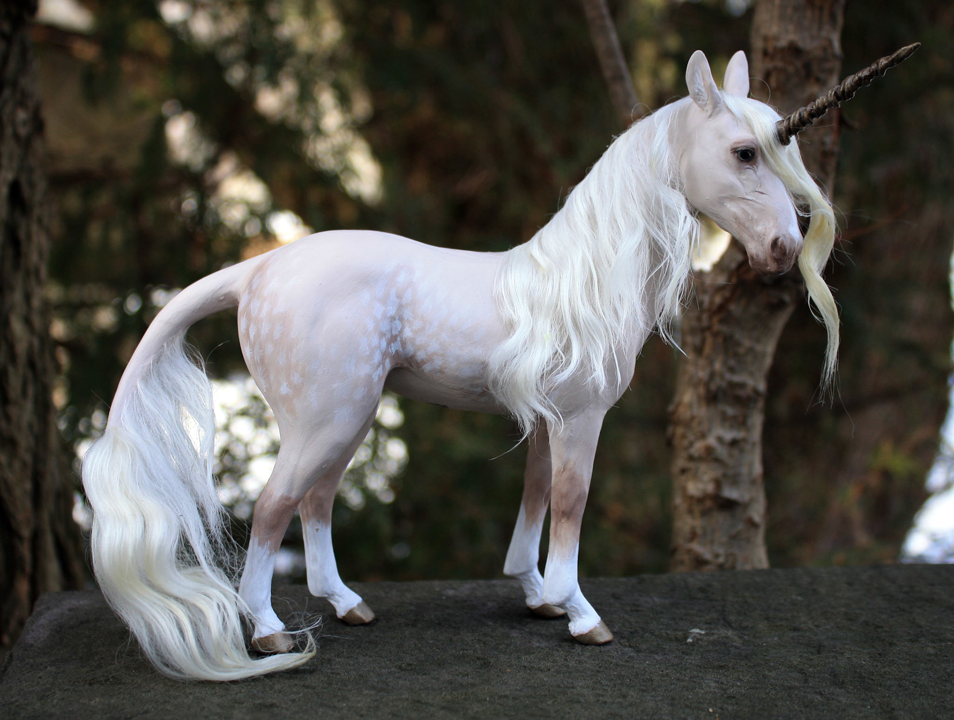 Unicorn sculpture made from polymer clay in 2015. About 7.5 inches tall, painted in acrylics and pigmented powders. Sold.