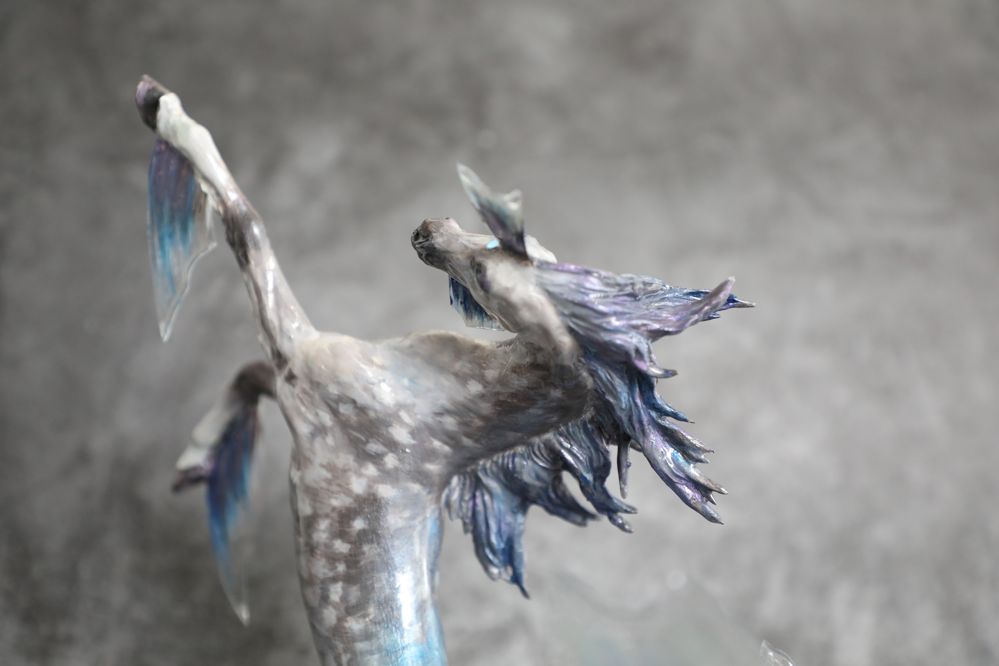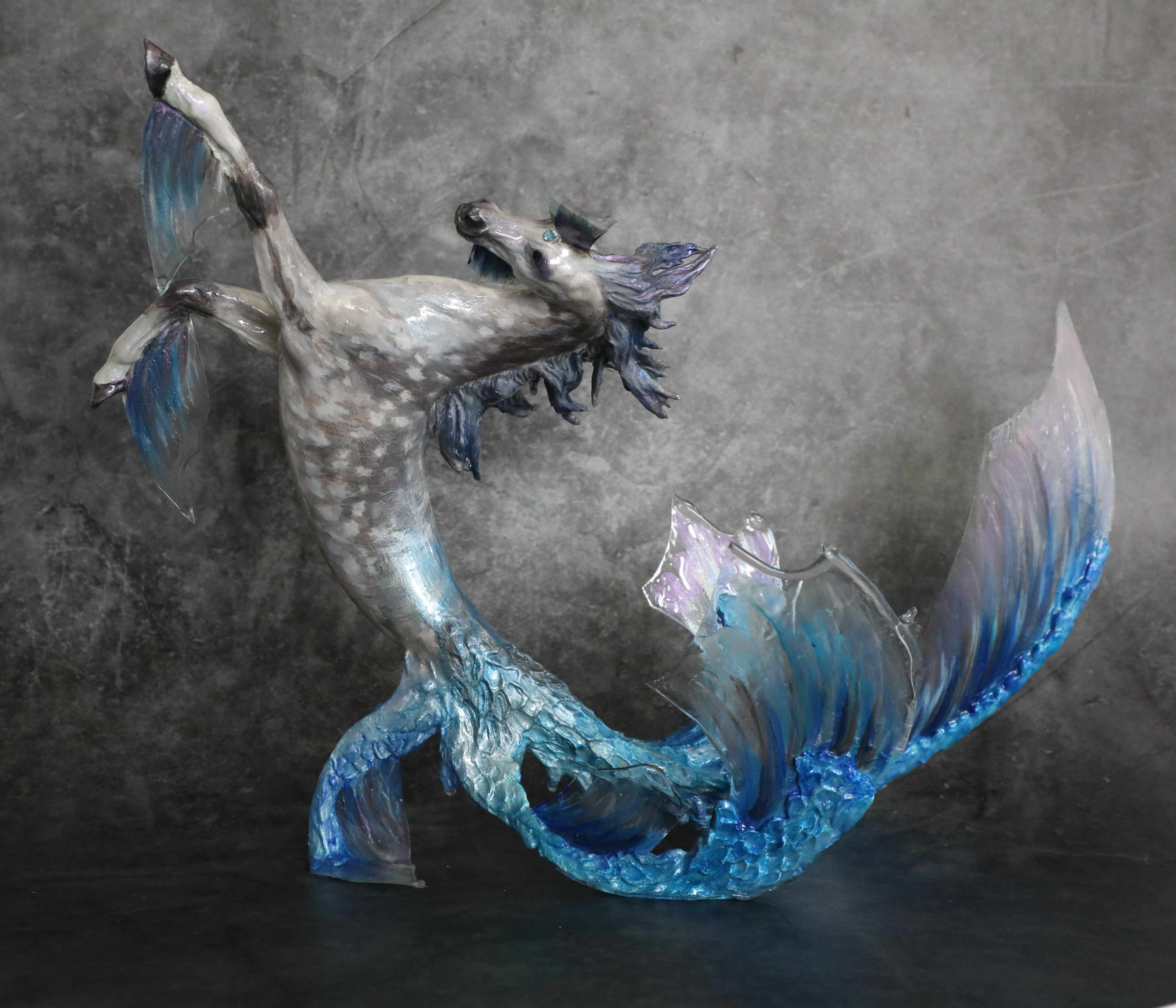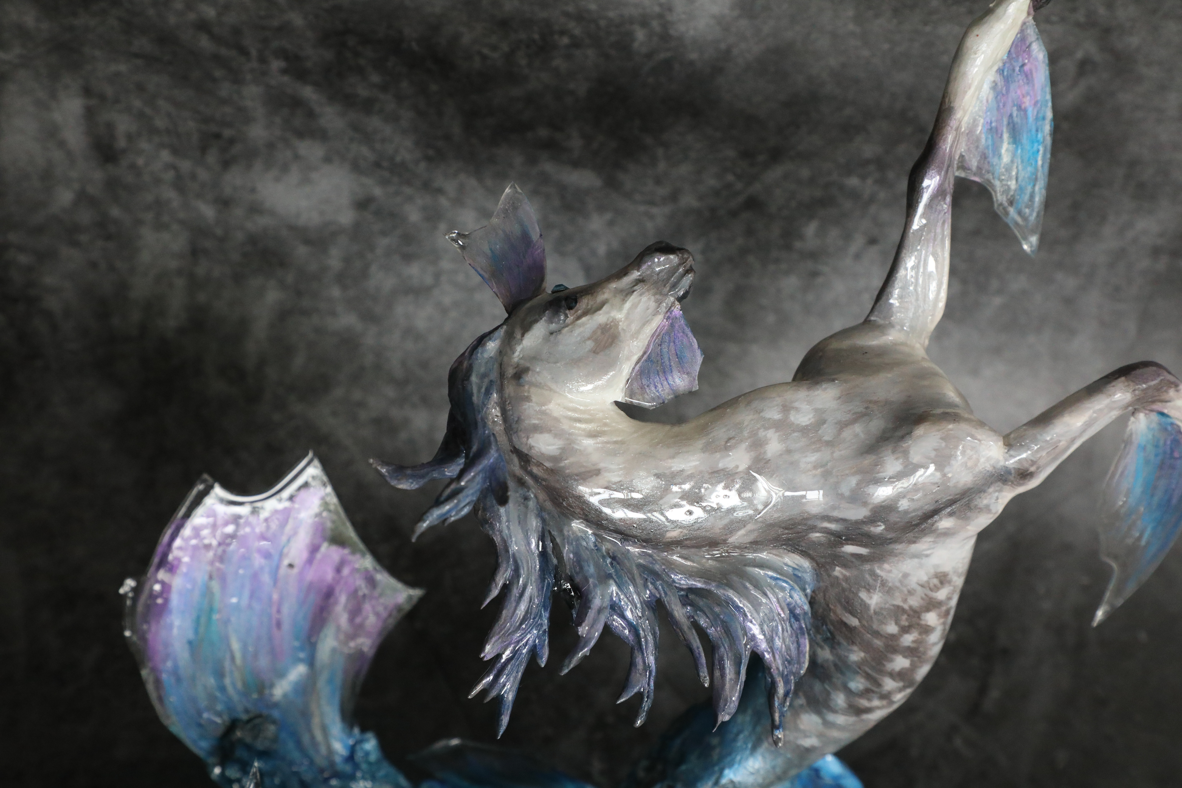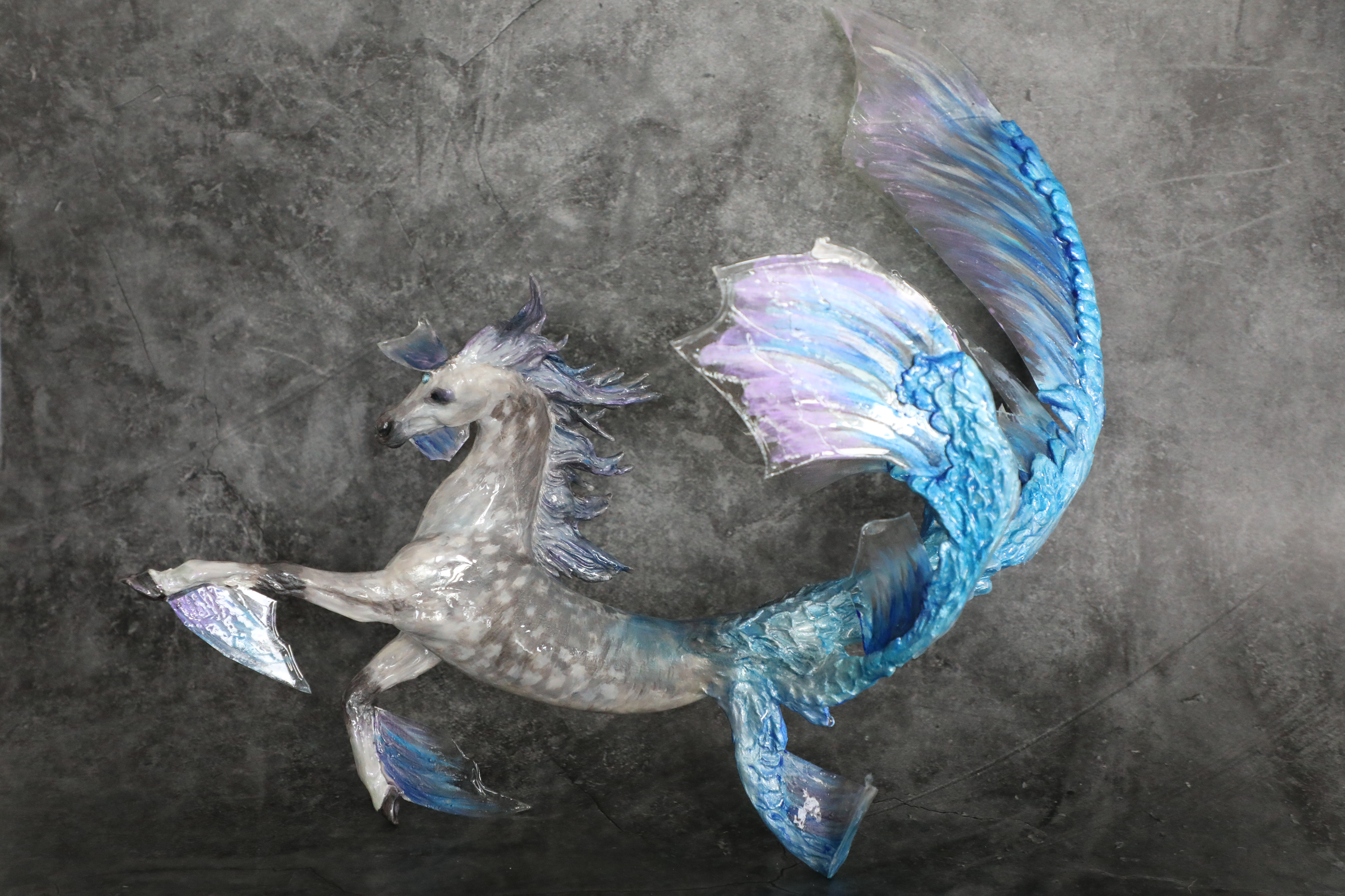 Prose is a completely one of a kind hippocampus sculpture. She was created with no molds used or taken. She was hand sculpted from lightweight clay and painted in layers of iridescent pigments and high gloss, durable resin. She is incredibly detailed. She is about 14 inches long in total. Please email janinehaq@gmail.com to order.