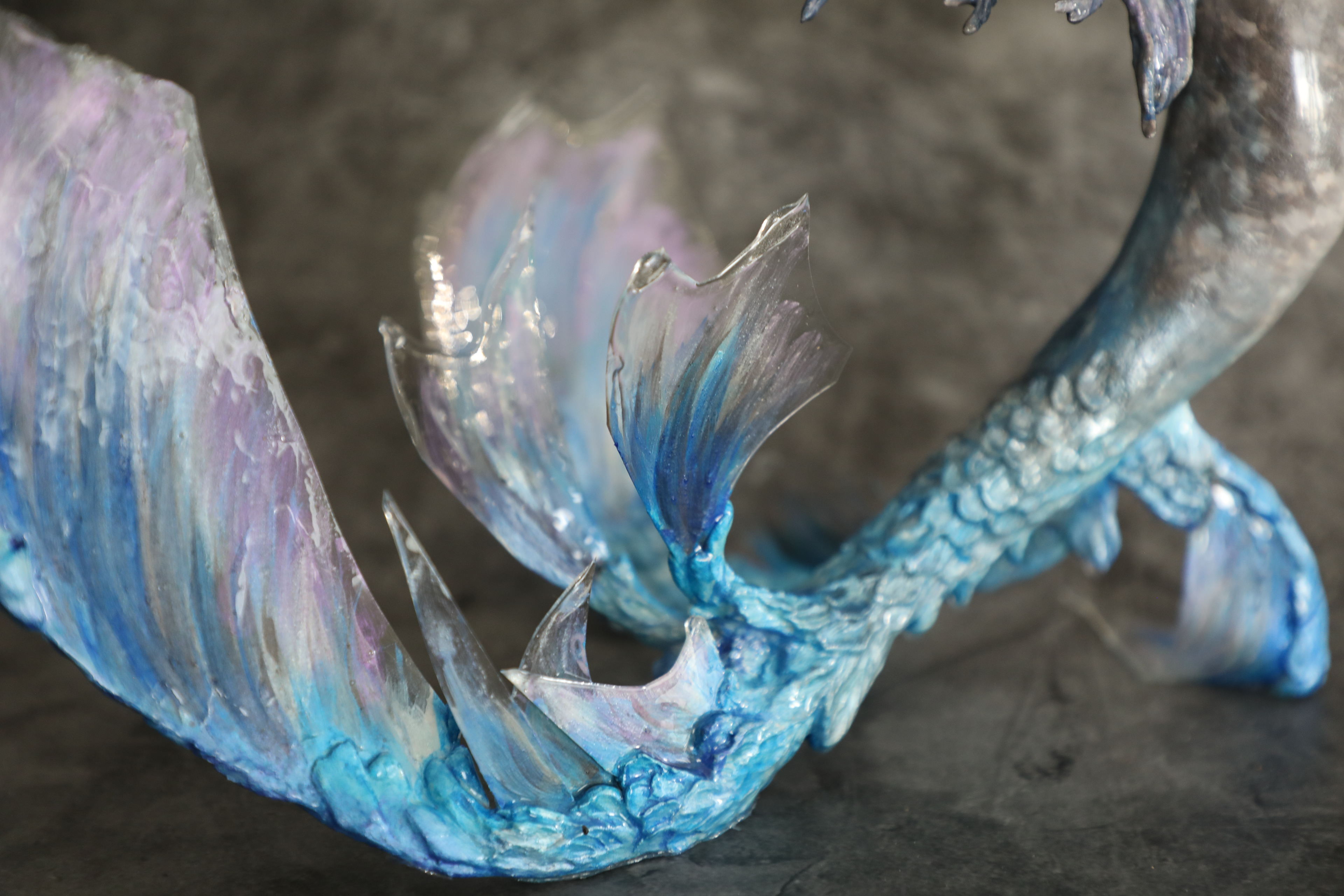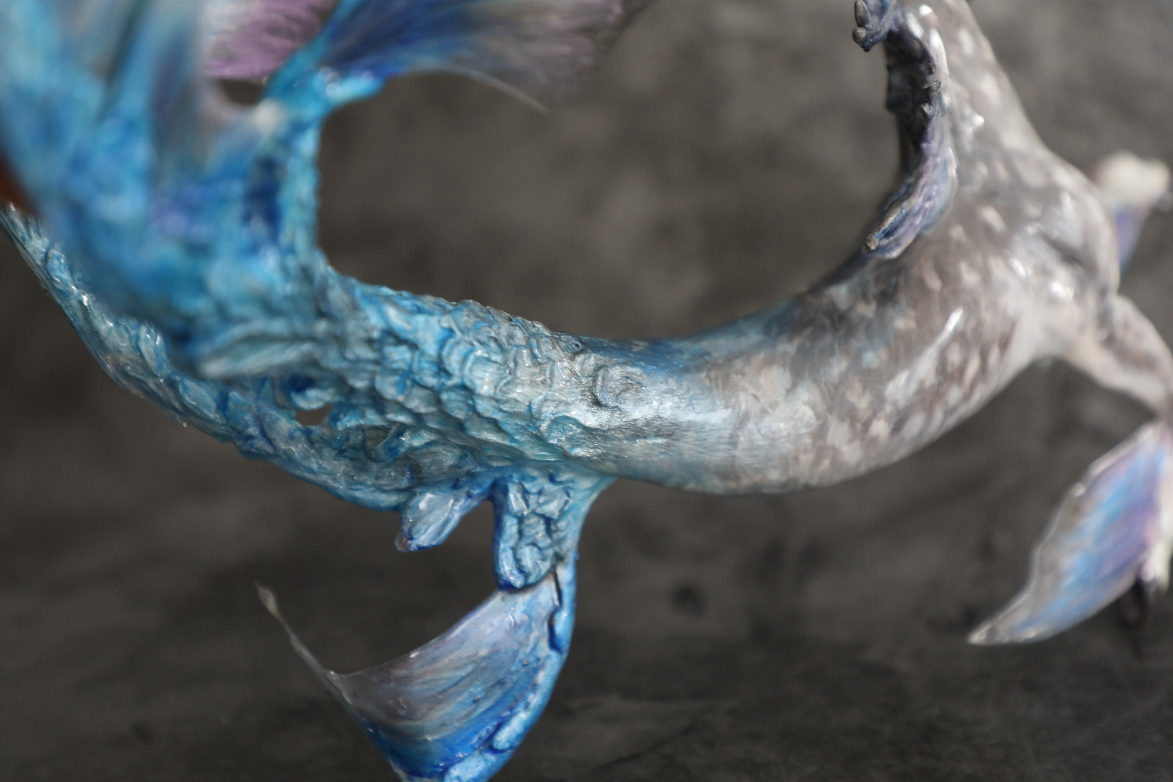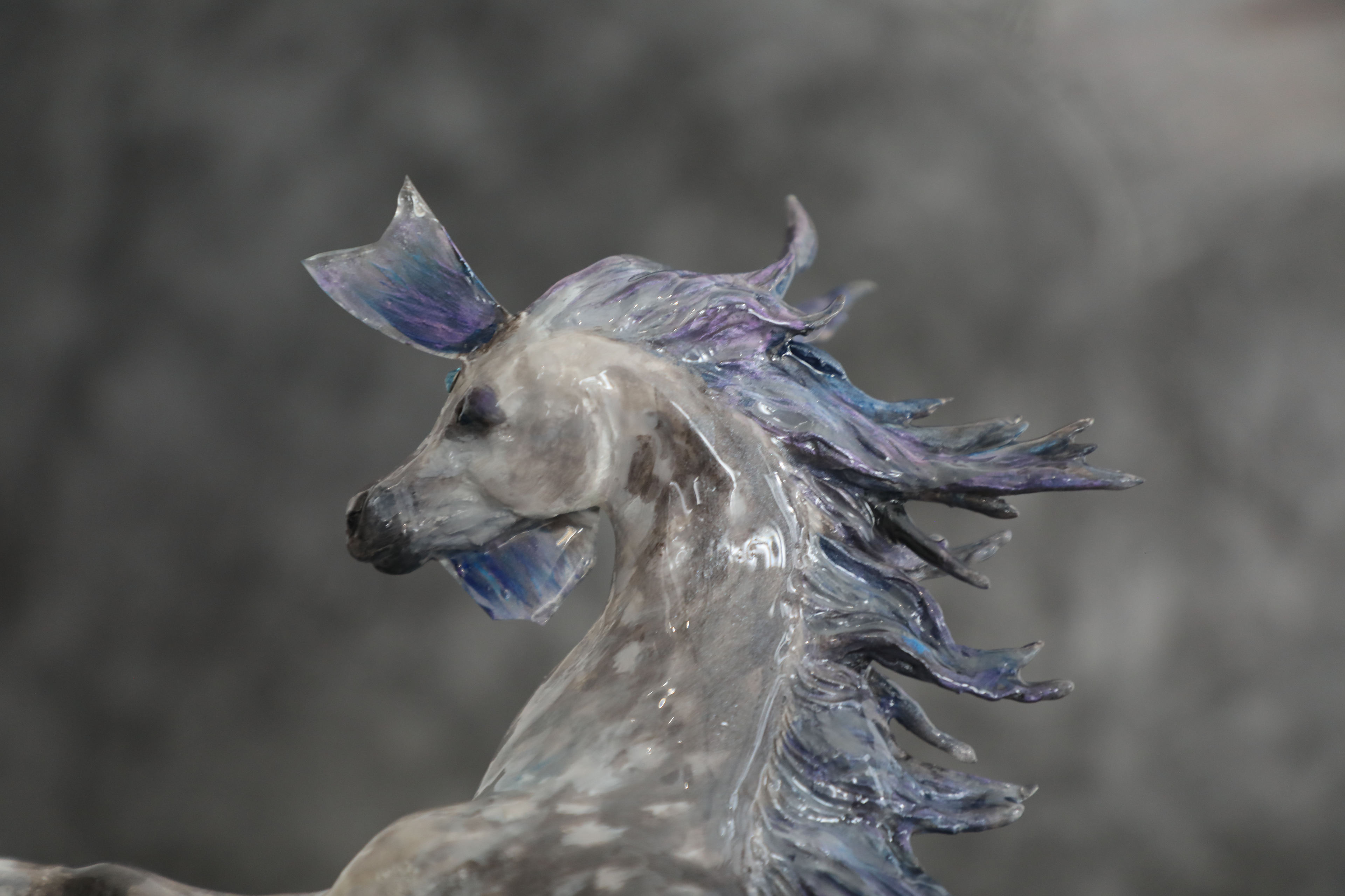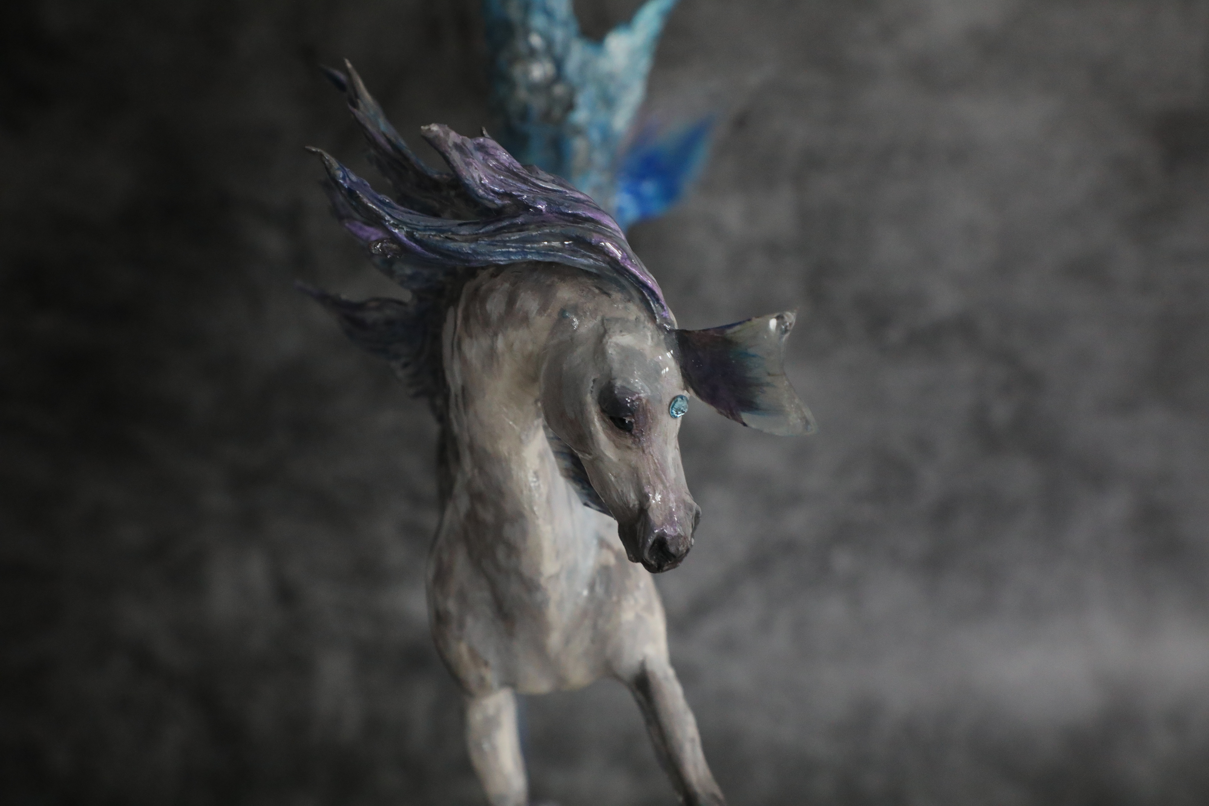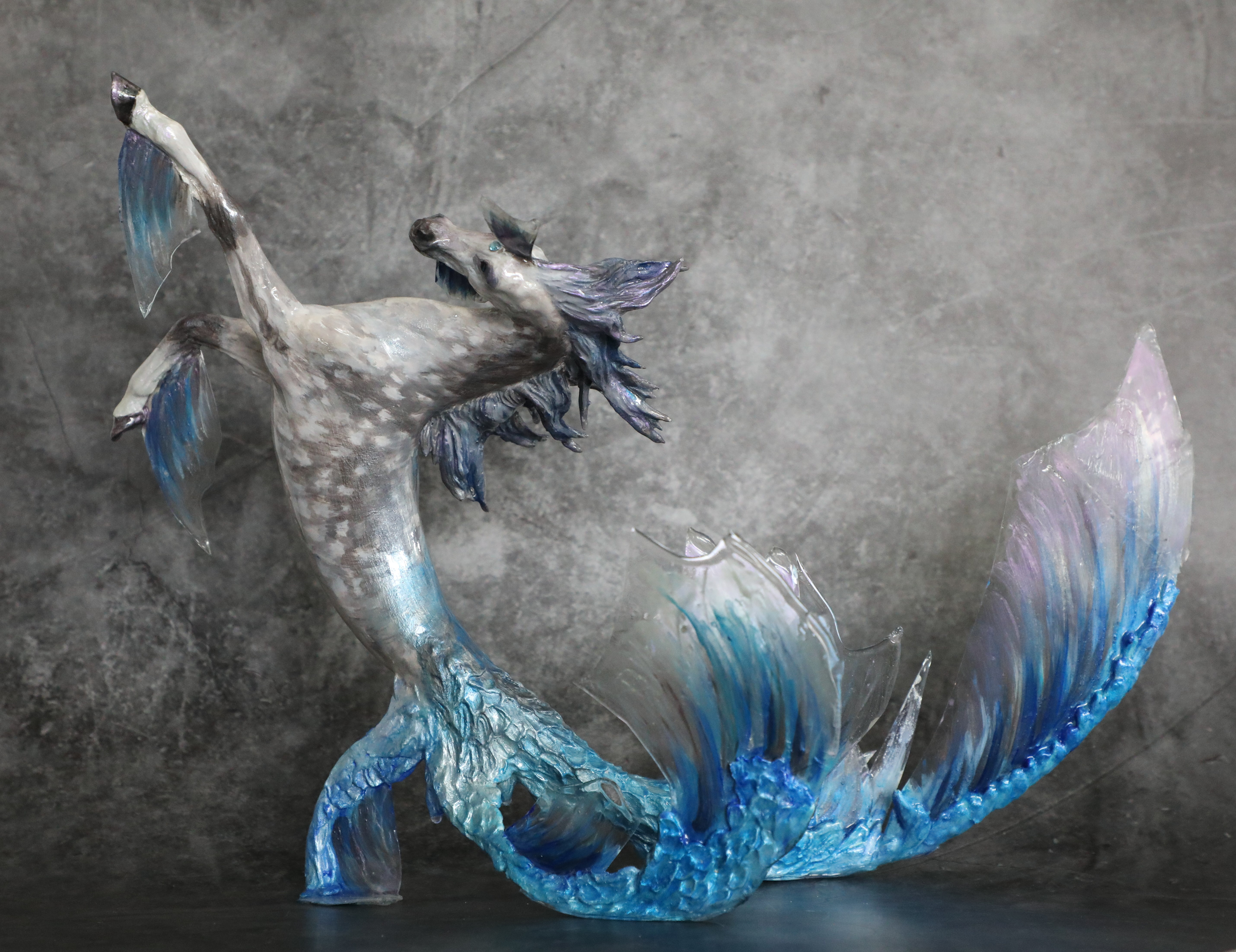 Prose is a completely one of a kind hippocampus sculpture. She was created with no molds used or taken. She was hand sculpted from lightweight clay and painted in layers of iridescent pigments and high gloss, durable resin. She is incredibly detailed. She is about 14 inches long in total. Please email janinehaq@gmail.com to order.