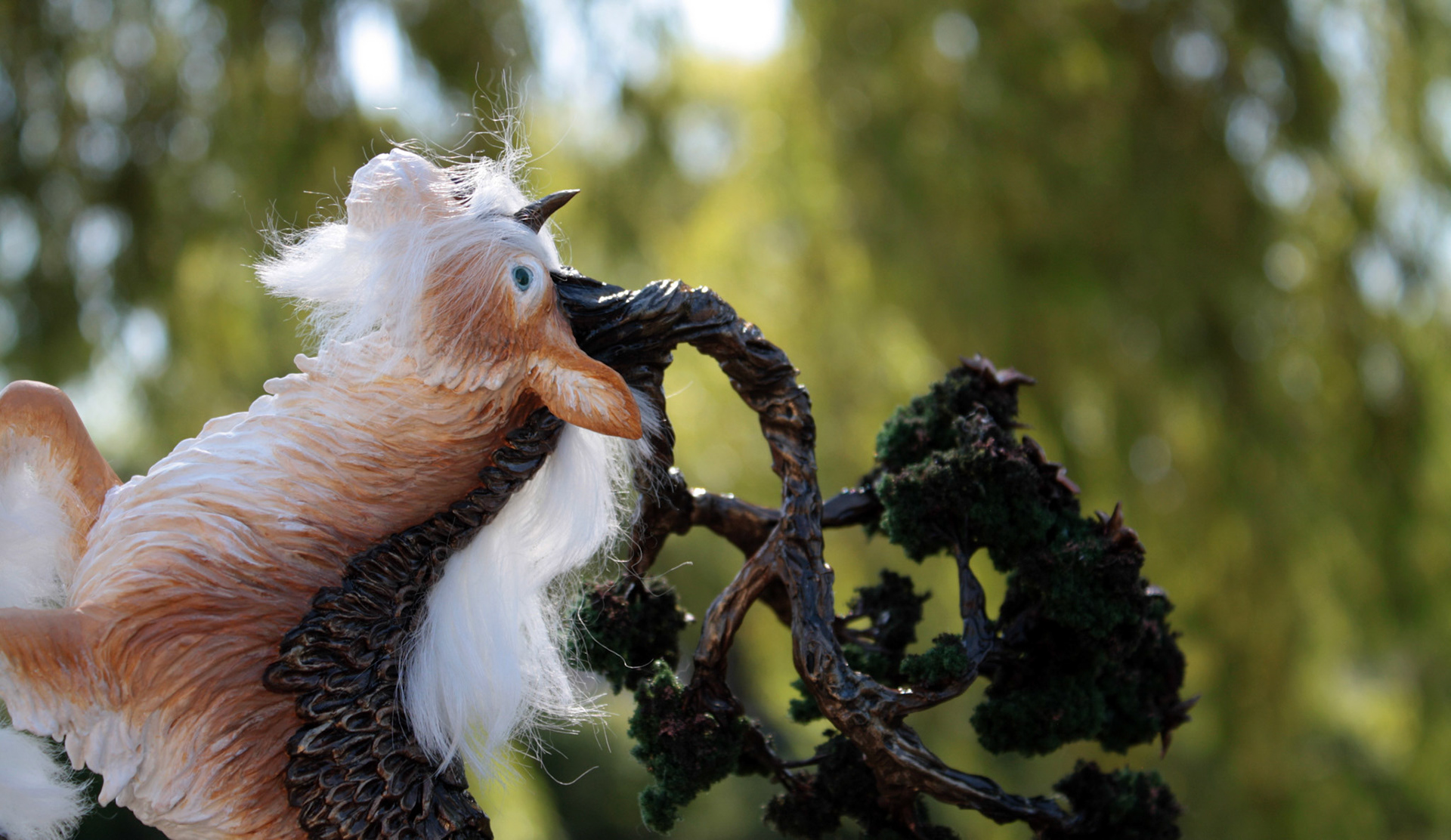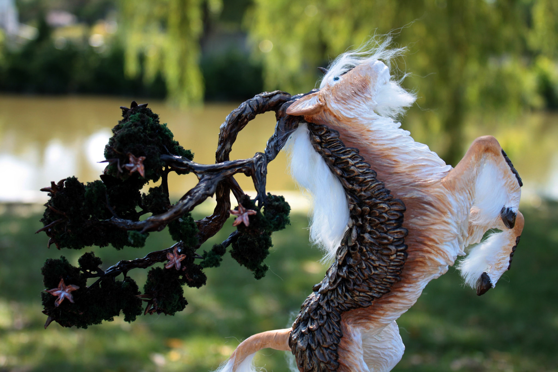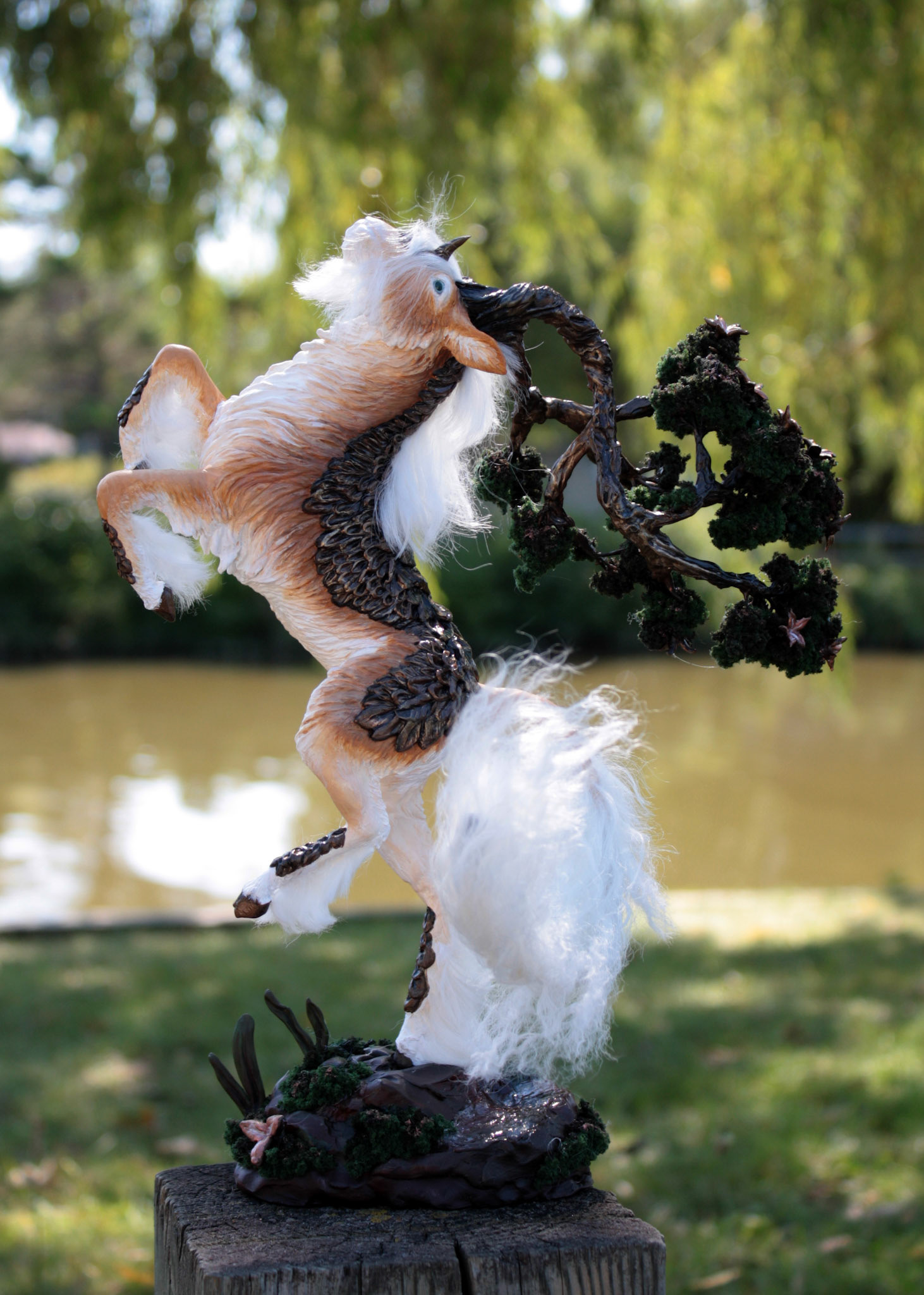 "Tundra" tree kirin fantasy sculpture, about 12 inches tall. Created in 2014 from polymer clay and acrylics. Sold.