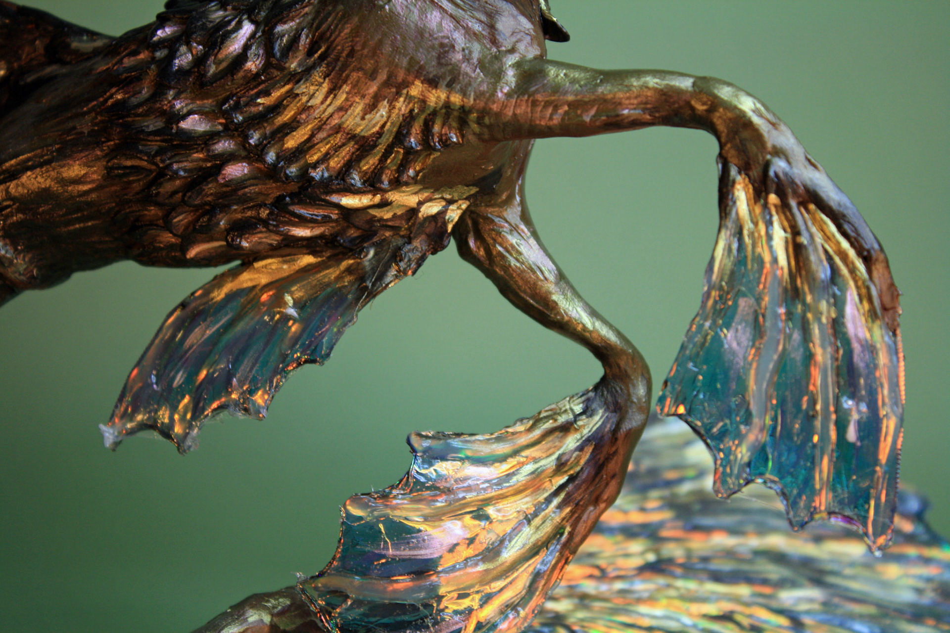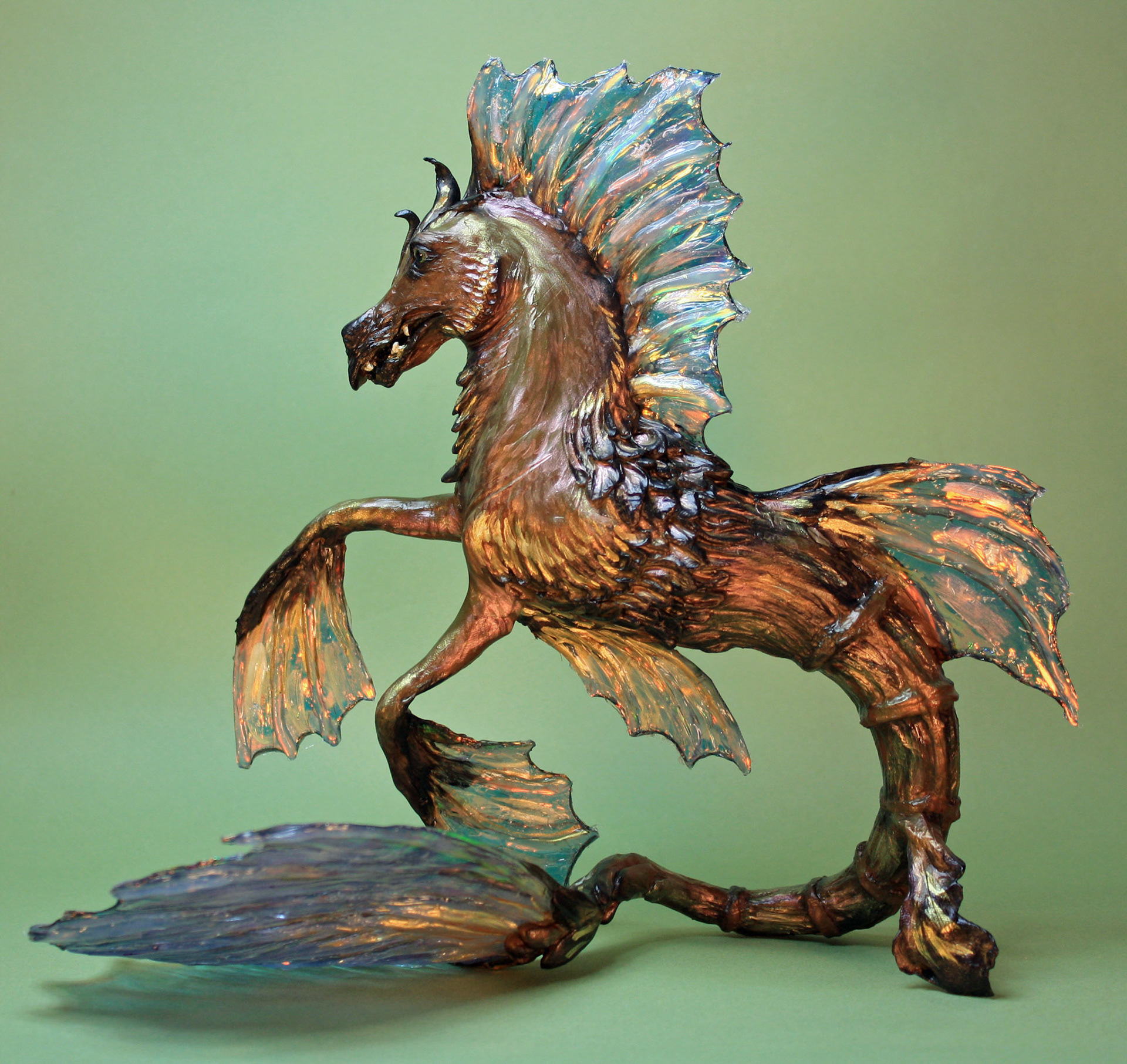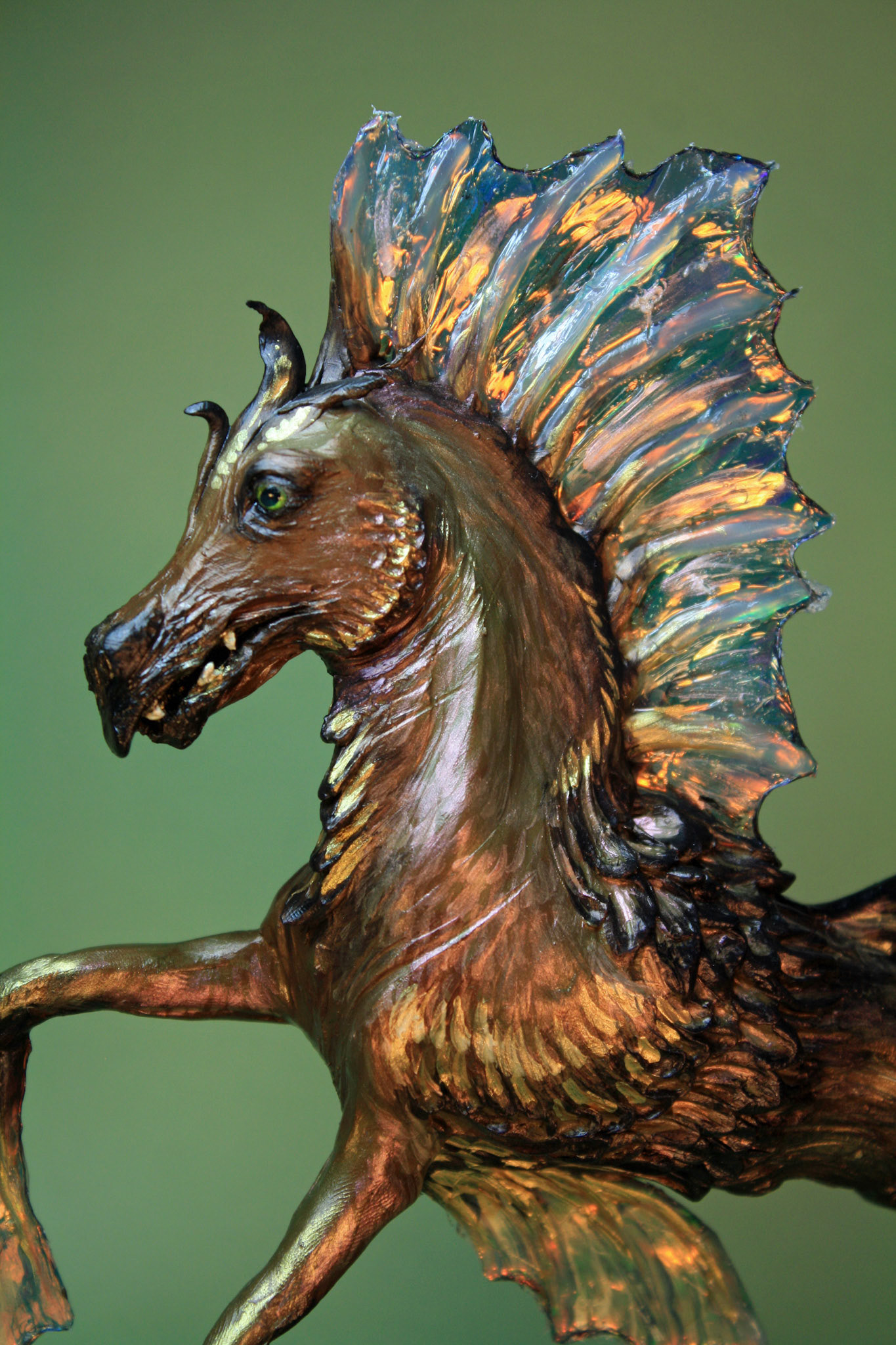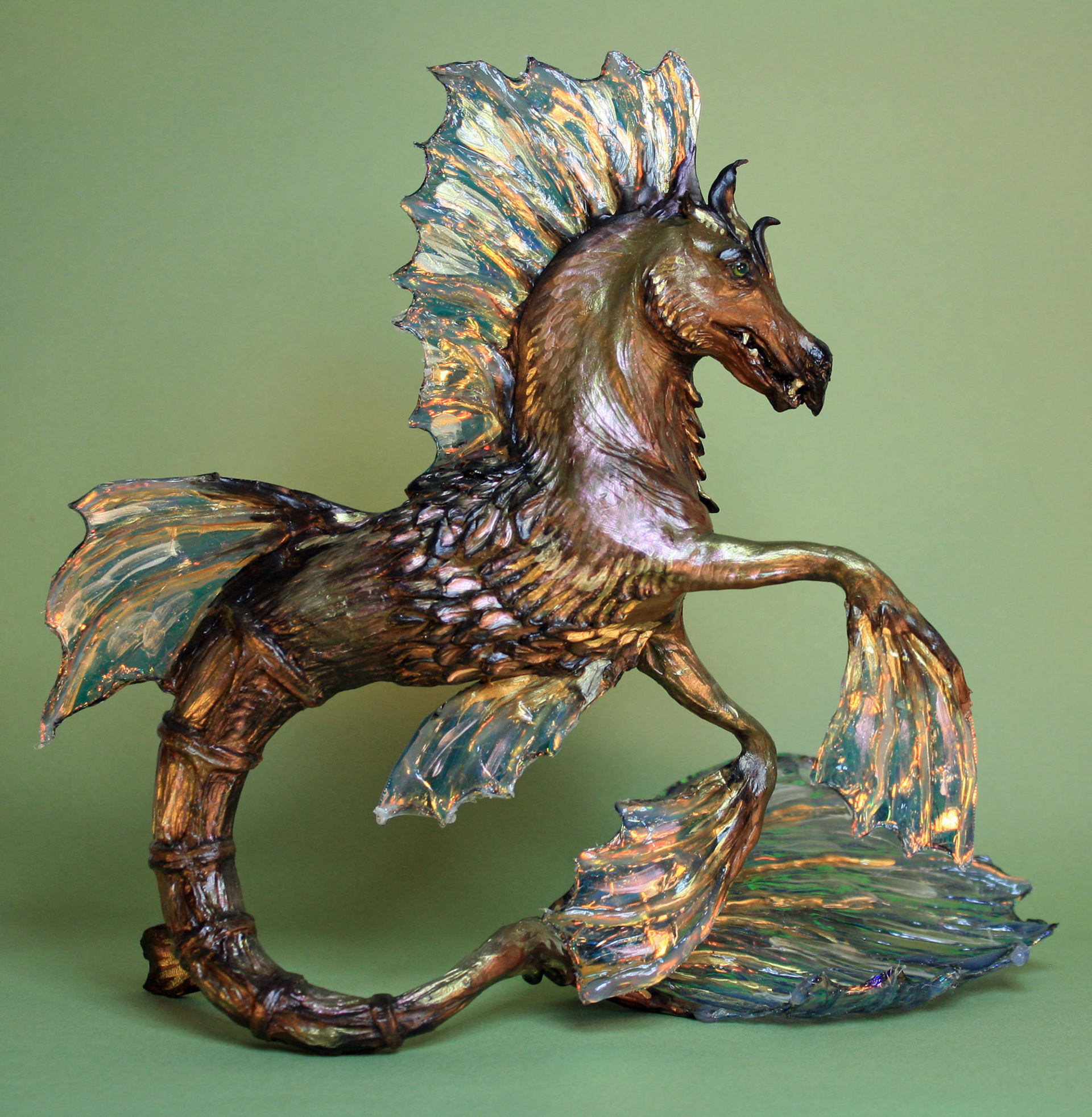 Hippocampus fantasy sculpture, about 8.5"x9.5 inch size. Created in 2014 from polymer clay and fantasy film, painted in acrylics. Sold.